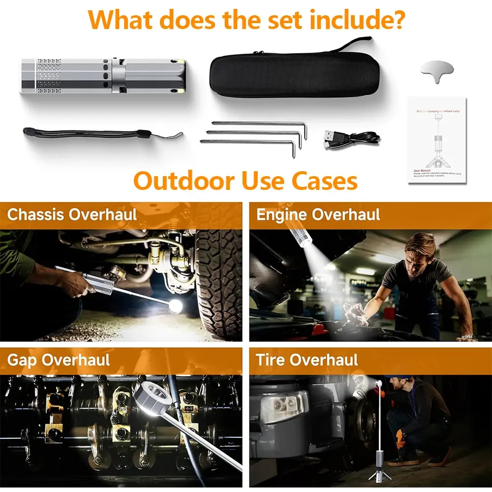 إمكانية حمل صغيرة وخفيفة الوزن: تم تصميم ضوء التخييم الخاص بنا بحامل ثلاثي القوائم قابل للسحب والطي والمغناطيسي، لسهولة النقل والتخزين.يسمح لك عمود المصباح القابل للتمديد بإضاءة المناطق التي يصعب الوصول إليها، مثل أسطح الخيمة أو الزوايا الضيقة، بينما يقف الحامل ثلاثي القوائم بشكل آمن على الأرض المسطحة أو العشب أو الرمل.يتيح المغناطيس المدمج التوصيل المريح بالمركبات أو القوارب أو الدراجات النارية، مما يجعله رفيقًا موثوقًا به للاستخدام أثناء التنقل.