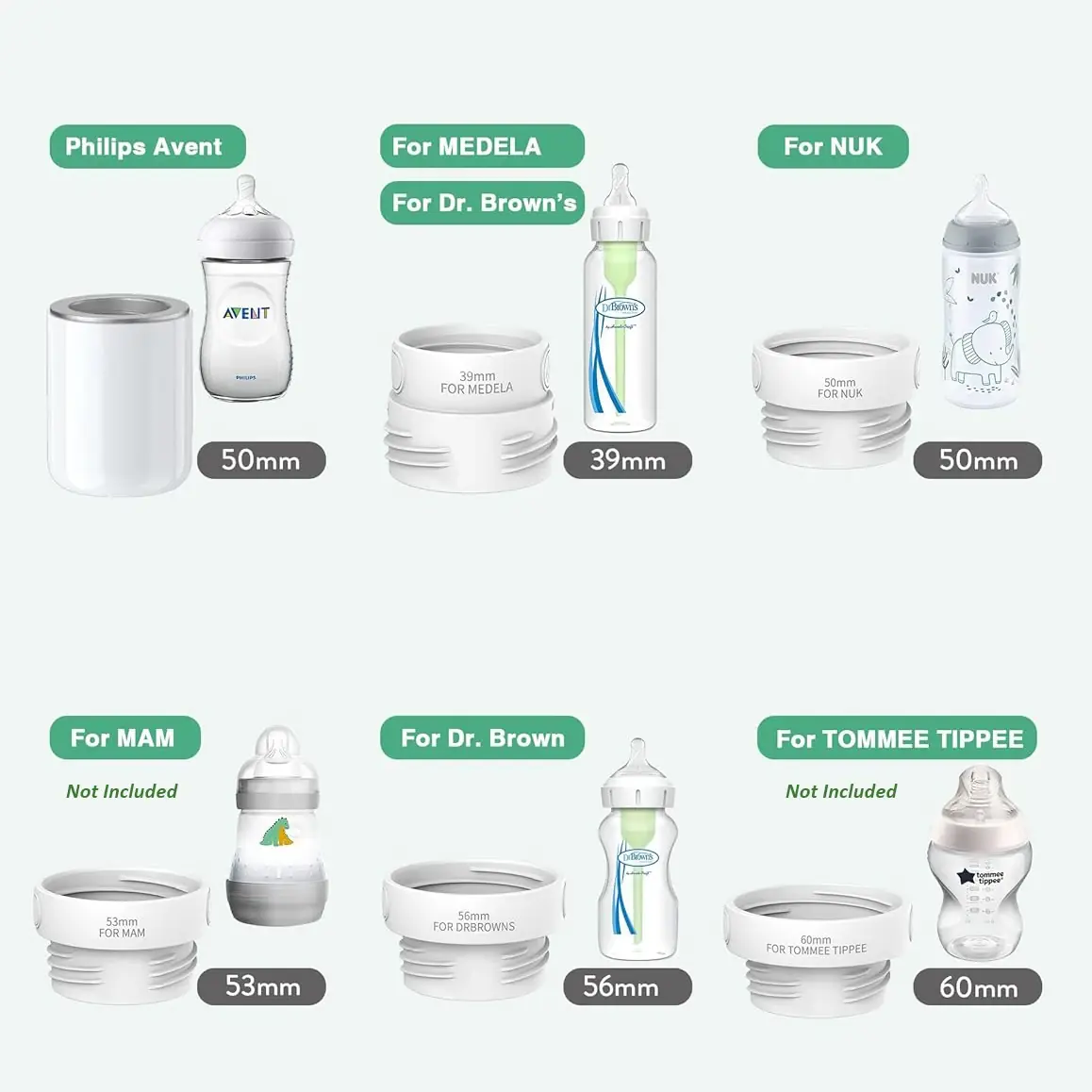 مصمم ليناسب معظم الزجاجات: يأتي جهاز تدفئة زجاجات الأطفال المحمول الخاص بنا مع 3 محولات بأحجام مختلفة، لذلك فهو يناسب معظم العلامات التجارية الكبرى للزجاجات مثل Philips AVENT وDr Brown’s وMedela وNUK وTommee Tippee وMAM (39 مم، 50 مم، 53 مم، 56 مم، 60 مم) والمزيد.المحولات مصنوعة من مواد فاخرة وخالية من مادة BPA من أجل سلامة طفلك.
