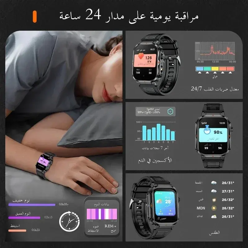 مراقبة معدل ضربات القلب، مراقبة الأكسجين في الدم، مراقبة ضغط الدم، تتبع النوم