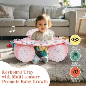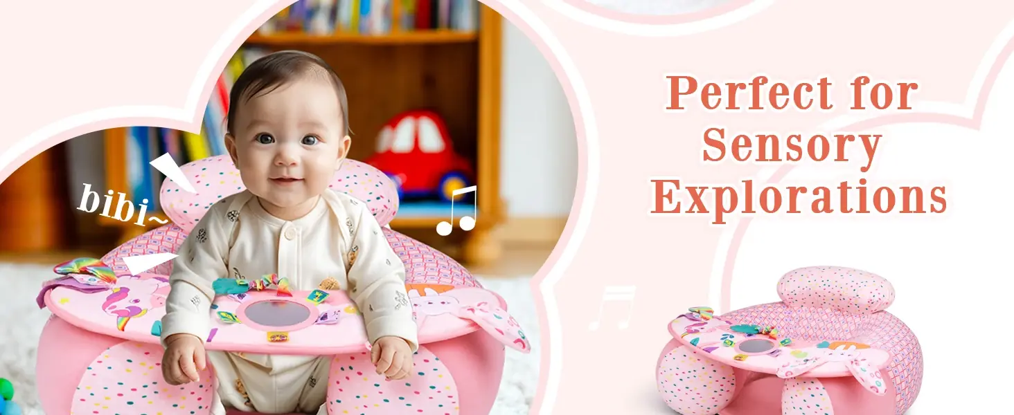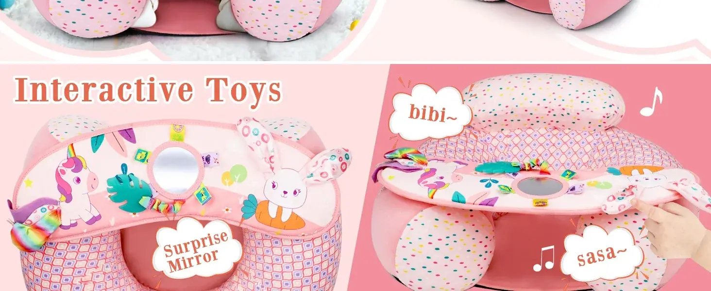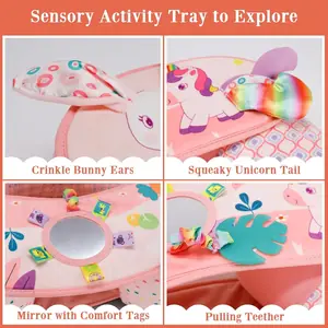 صينية حسية قابلة للفصل: صينية النشاط مصممة بمرايا ملونة وعضاضات، وصافرة BB مدمجة، وصوت مجعد وخشخشة، مصحوبة بفيلات وثعالب لطيفة على الجانبين، مما يعزز التطور الحسي والقدرة الإدراكية للطفل، وفي الوقت نفسه يعزز التفاعل بين الوالدين والطفل.