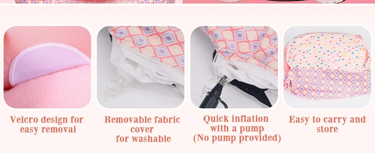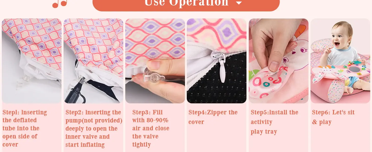 سهل الاستخدام: مقعد الجلوس للأطفال سهل التركيب، ضع الحلقة الداخلية داخل الغطاء واستخدم المضخة للنفخ بسرعة، تصميم السحاب يخفي منفذ النفخ بشكل مثالي، وبفضل التصميم المقاوم للتسرب، تحتاج إلى الضغط على الصمام عند التفريغ.