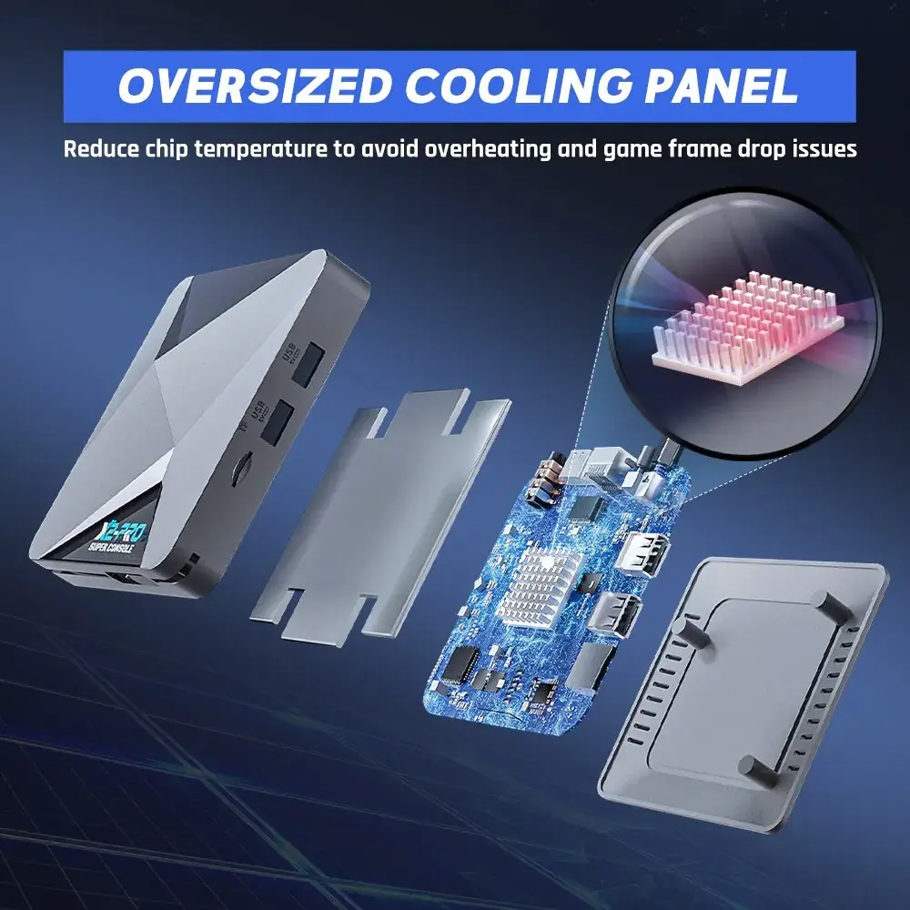 قمنا بتصميم مشتت حراري كبير الحجم خصيصًا لجهاز Super Console X2 Pro، مما يعزز كفاءة تبديد الحرارة بنسبة 30% ويمنع تباطؤ الألعاب الناتج عن ارتفاع درجة حرارة الشريحة.