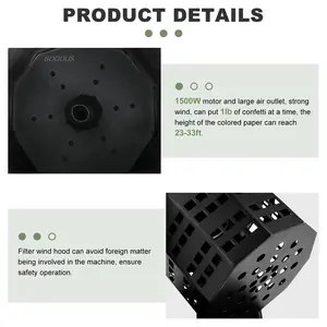 【Strong Power】With 1500W motor and large air outlet, strong wind, can put 1lb of confetti at a time, the height of the colored paper can reach 4-5m. (13-17ft)