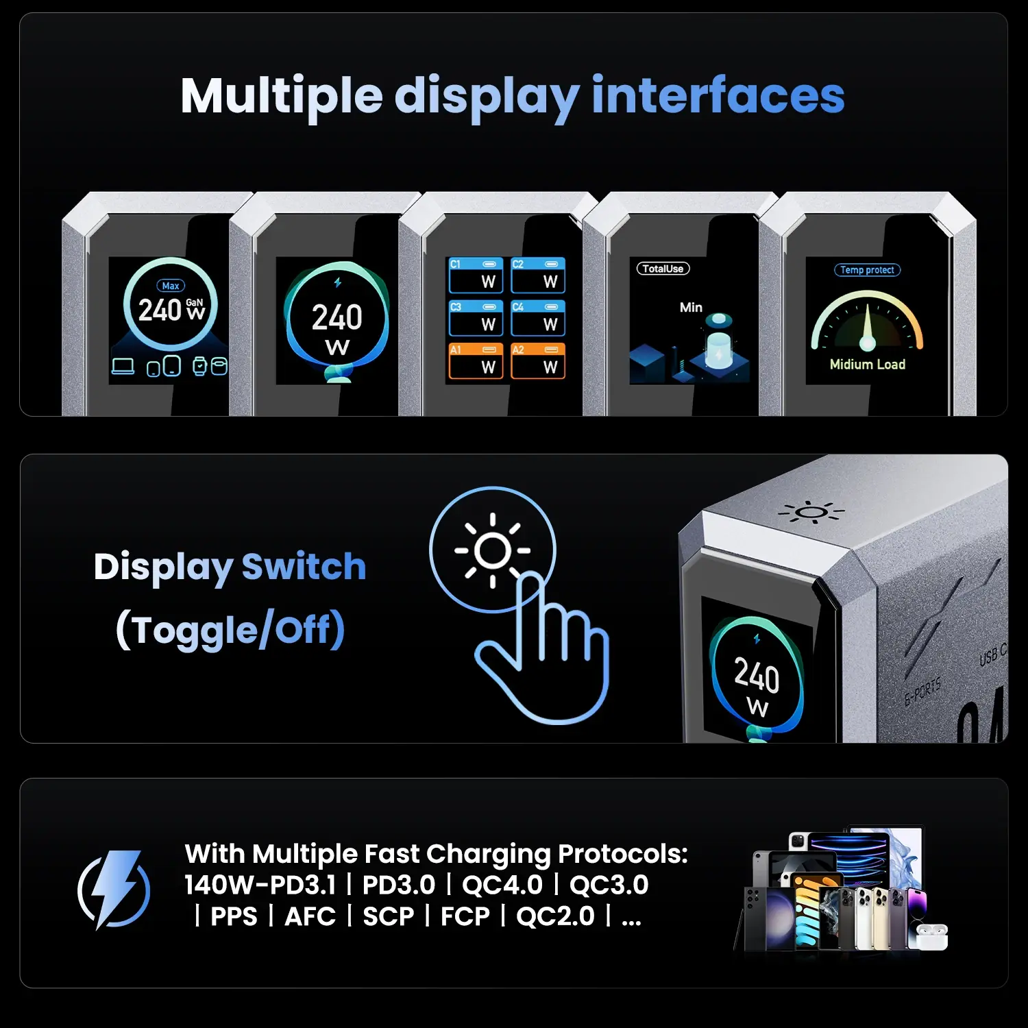 4 يو اس بي سي | 2 يو اس بي ايه | 140W-PD3.1 I الإضاءة المحيطة I مفتاح الإضاءة