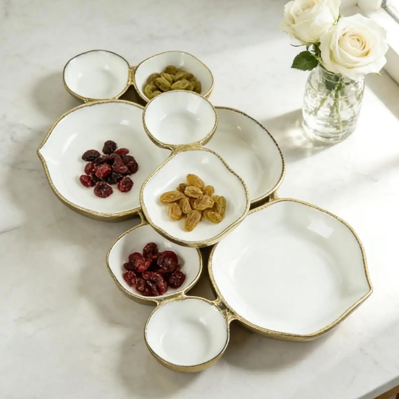 تُعد صينية العرض متعددة الأوعية حلاً أنيقًا ومتعدد الاستخدامات لتنظيم وتقديم مجموعة متنوعة من المواد الغذائية.تعمل هذه الصينية المزخرفة المكونة من تسع شبكات على تحسين ديكور المنزل مع توفير وظائف عملية.مثالية لتقديم الوجبات الخفيفة أو المكسرات أو الفاكهة أو الحلوى أو الوجبات أو المقبلات، فهي تضيف سحرًا إلى أي إعداد لغرفة طعام.مثالية للحفلات أو حفلات الزفاف أو التجمعات غير الرسمية، تضمن الصينية عرض مكافآتك بطريقة جذابة ومنظمة.صُنعت صينية العرض هذه لتكمل المناسبات المختلفة، وهي تجمع بين المنفعة والجذب الجمالي، مما يجعلها ضرورية للاستضافة والاستخدام اليومي.قم بتحسين عرضك باستخدام صينية العرض متعددة الأوعية، المصممة لتلبية احتياجات التقديم المتنوعة دون عناء.